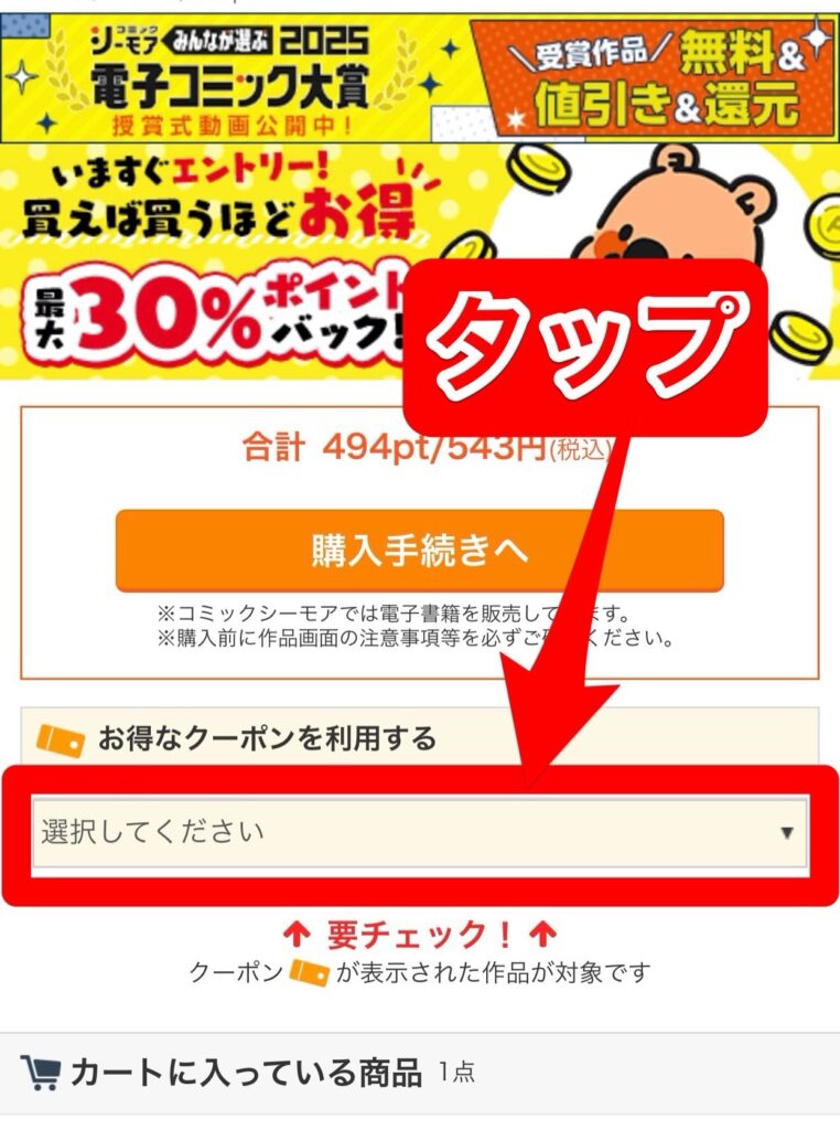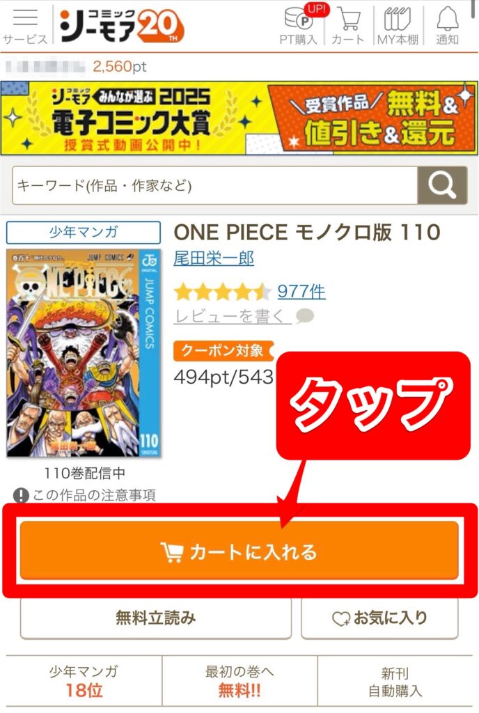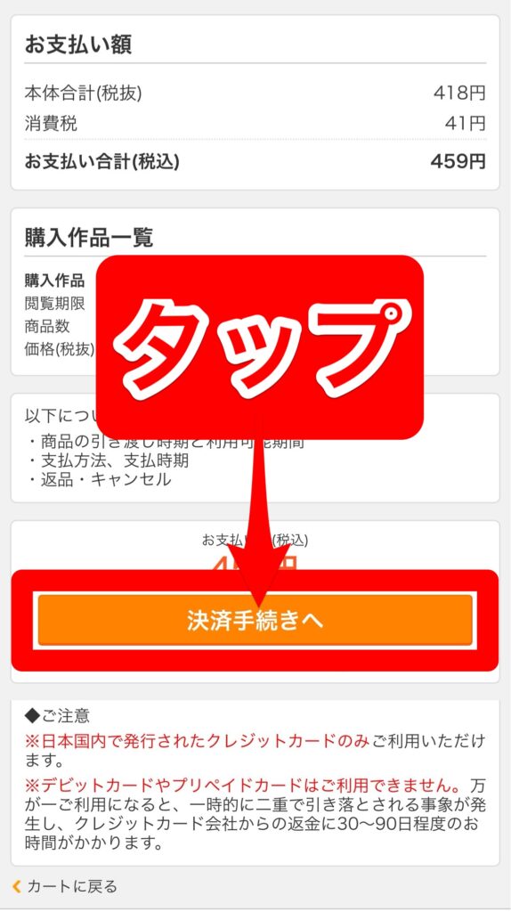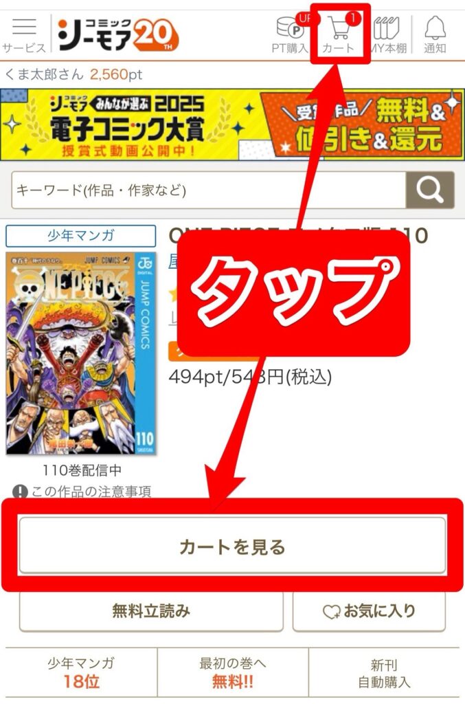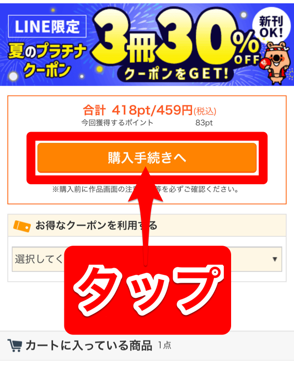 ①購入する場合は、「カートに入れる」をタップして、購入手続きに進む