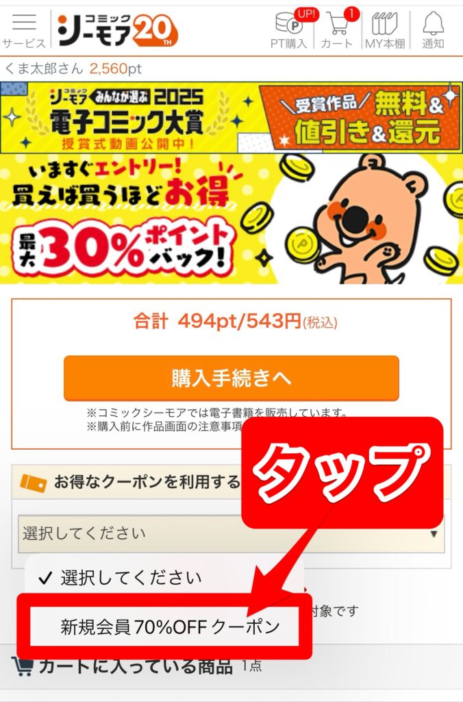 - 70%OFFクーポンがもらえる(上限2,000pt/円)