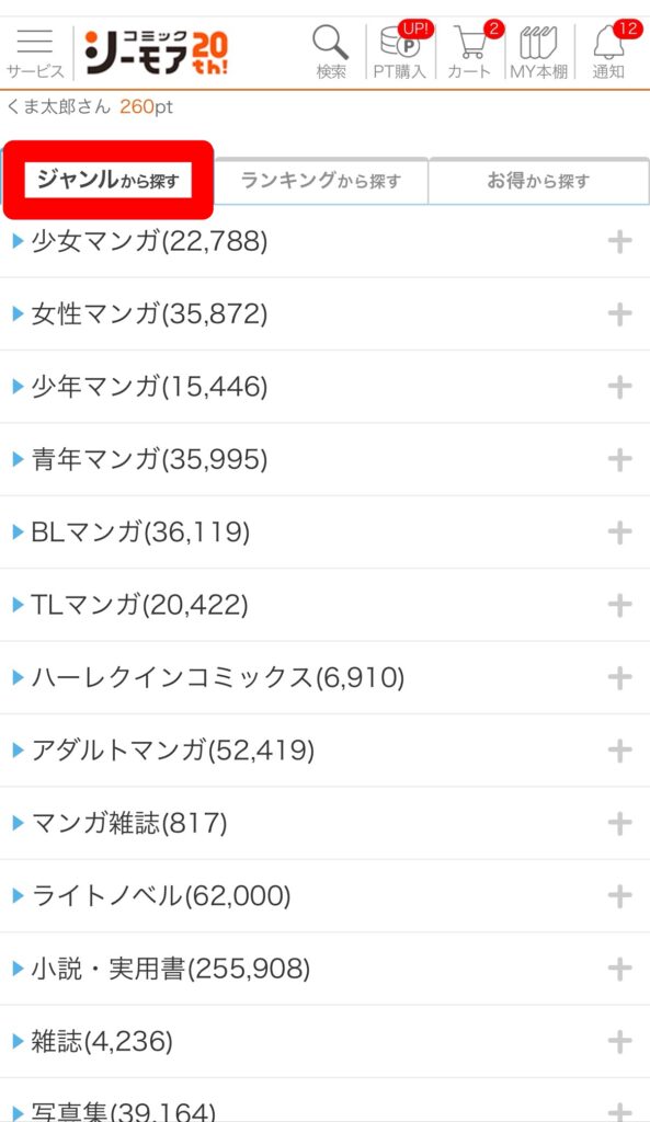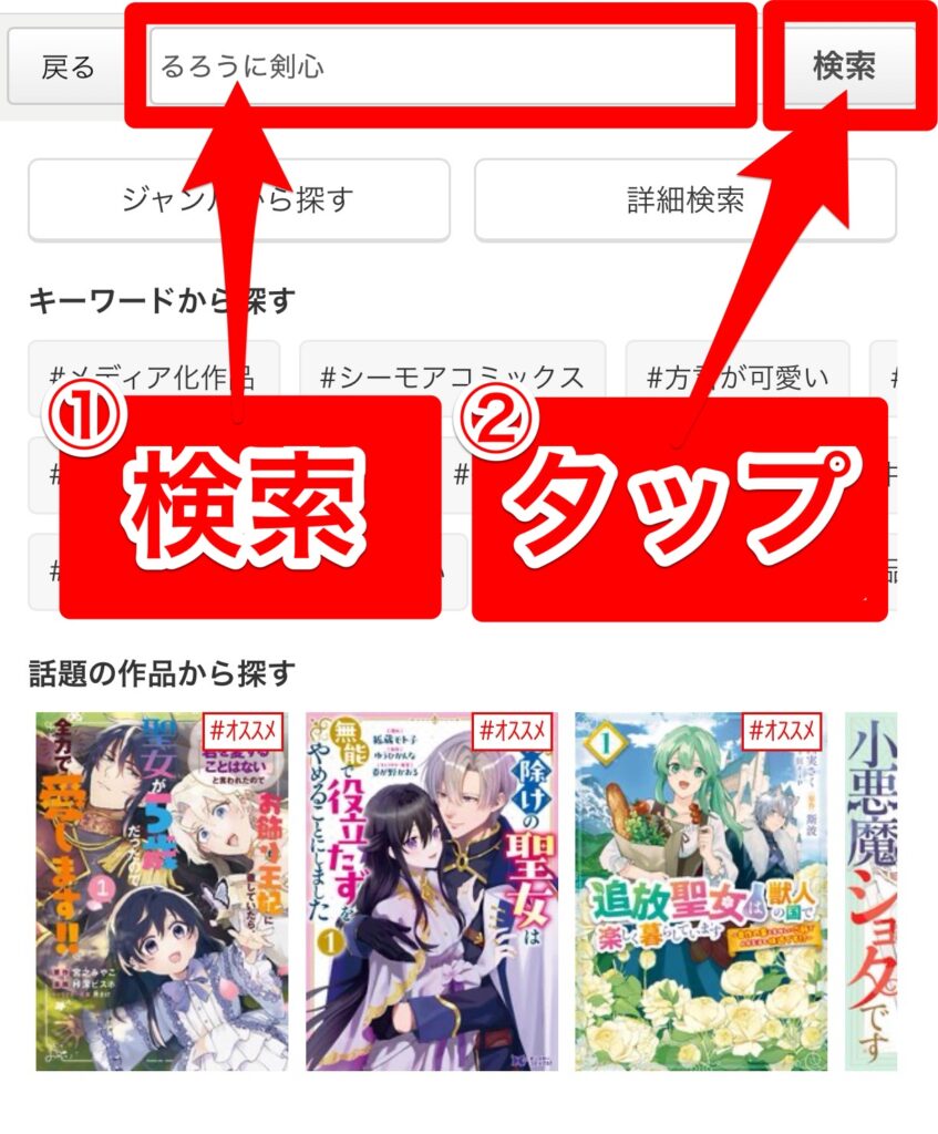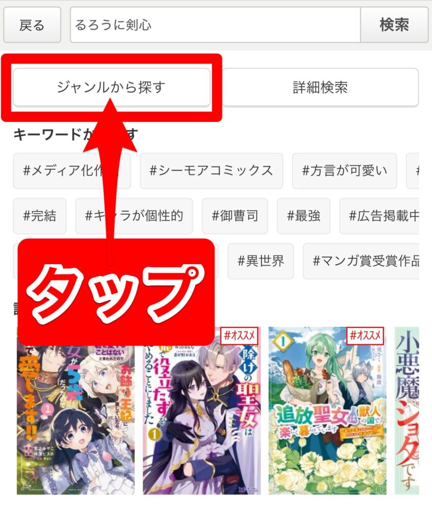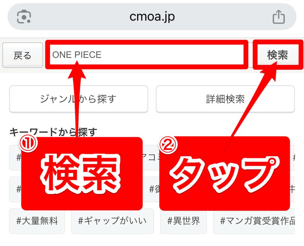トップページにある検索バーに作品名や作者名を入力するだけ!ジャンル別の絞り込みも可能で、好みの作品がすぐ見つかります。
