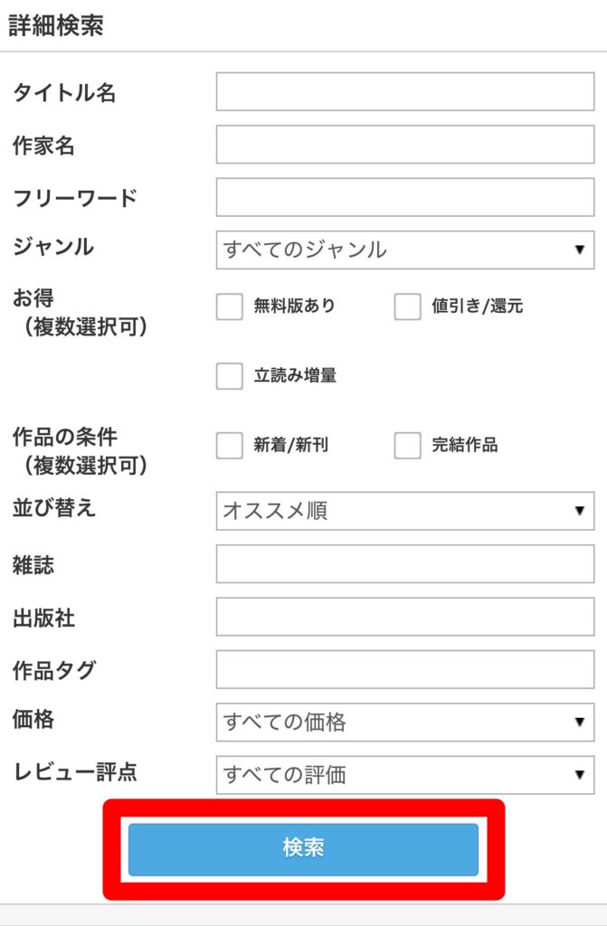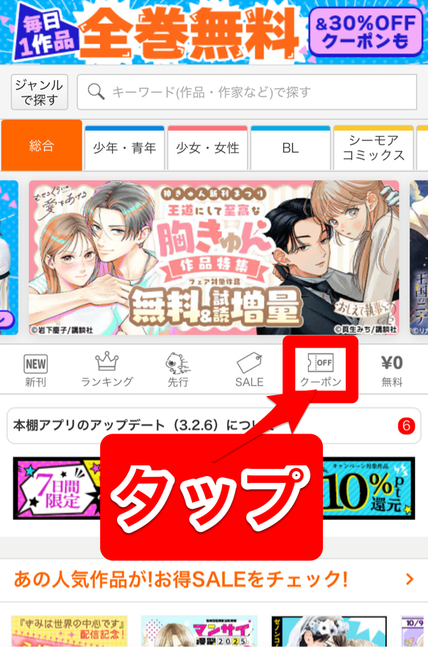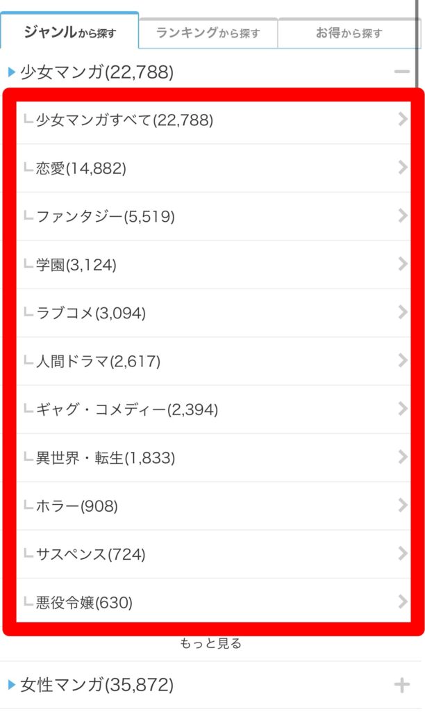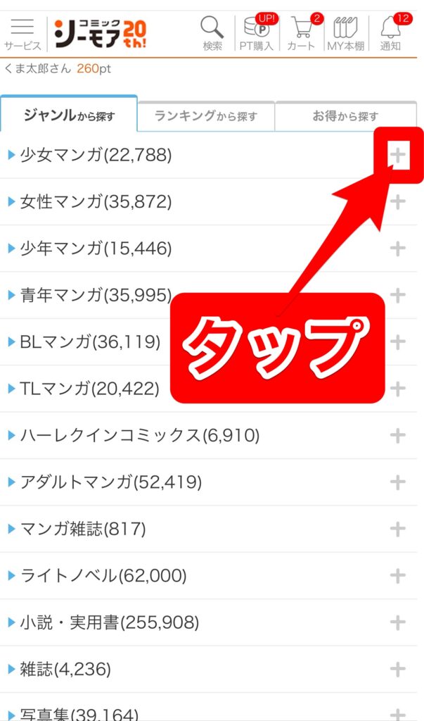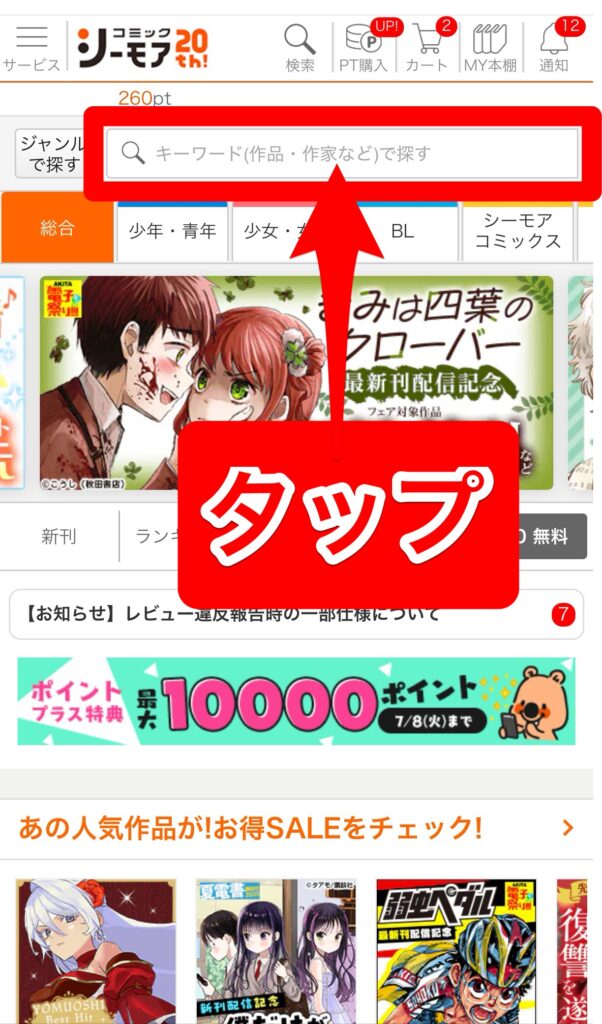 トップページにある検索バーに作品名や作者名を入力するだけ!ジャンル別の絞り込みも可能で、好みの作品がすぐ見つかります。