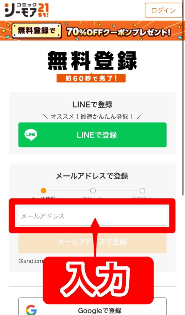 - Step3「LINEで登録」か、「メールアドレス」を入力し、登録ボタンを押す
