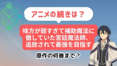 アニメ続編ガイド 【毎週更新】アニメ「味方が弱すぎて補助魔法に徹していた宮廷魔法師、追放されて最強を目指す」1期は原作漫画のどこまで?続きはどこから? 話題の「味方が弱すぎて補助魔法に徹していた宮廷魔法師、追放されて最強を目指す」!アニメの続きが気になる!という人に向けて、漫画や小説の何巻から読んだらいいのか、について解説しています。 アニメ続編ガイド