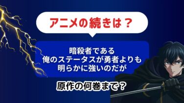 アニメ続編ガイド 【毎週更新】アニメ「暗殺者である俺のステータスが勇者よりも明らかに強いのだが」1期は原作漫画のどこまで?続きはどこから? 話題の「暗殺者である俺のステータスが勇者よりも明らかに強いのだが」!アニメの続きが気になる!という人に向けて、漫画や小説の何巻から読んだらいいのか、について解説しています。 アニメ続編ガイド