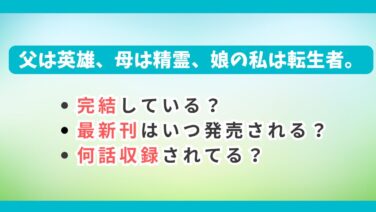 少年・青年漫画 【完結してる?】漫画「父は英雄、母は精霊、娘の私は転生者。」14巻の発売日はいつ?最新刊は13巻! 話題の『父は英雄、母は精霊、娘の私は転生者。』!この作品は完結しているのか、コミックは何巻まででてるのか、お得に読む方法もあわせてお伝えします。 少年・青年漫画発売日予想